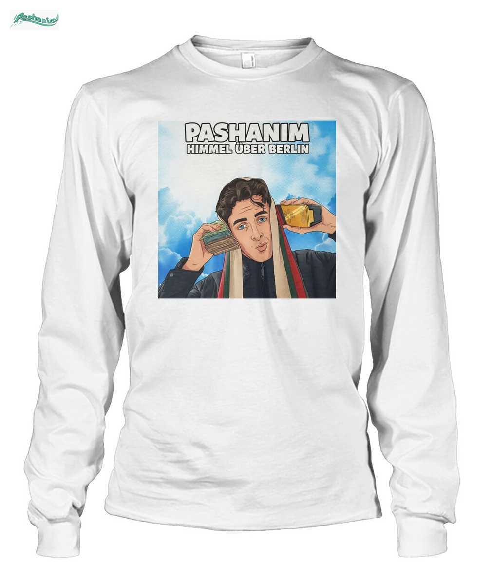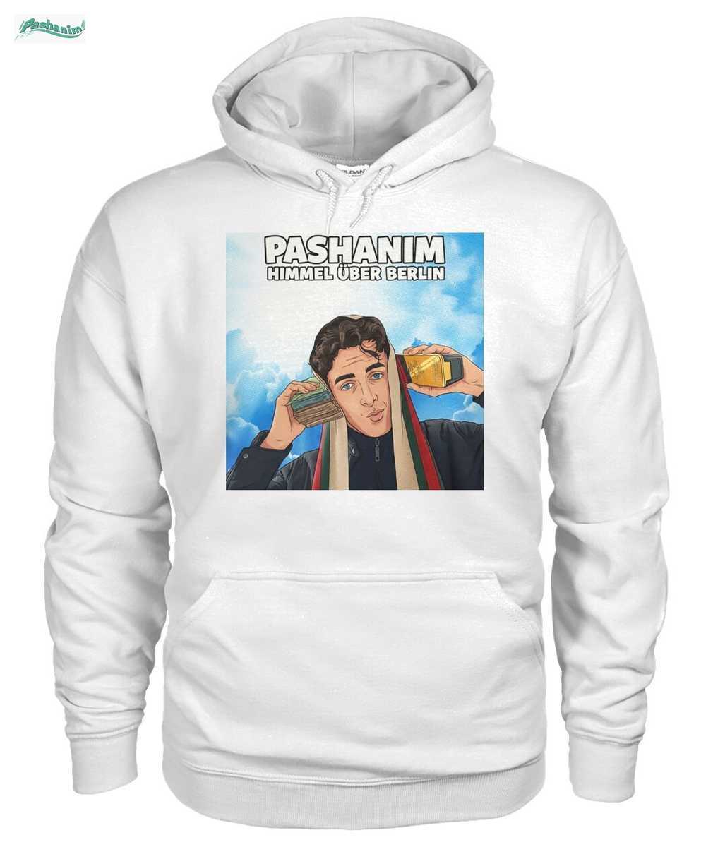 Zeigen Sie Ihre Unterstützung für den deutschen Rapper Pashanim mit diesem einzigartigen T-Shirt. Das Design präsentiert eine coole Comic-Illustration von Pashanim vor einem leuchtend blauen Himmel, inspiriert von seinem Werk ‘Himmel über Berlin’. Er hält einen Stapel Geldscheine und einen Goldbarren an seine Ohren, ein ikonisches Bild für Fans, das Erfolg und den Aufstieg in der Musikszene symbolisiert. Der markante Schriftzug ‘PASHANIM’ und ‘HIMMEL ÜBER BERLIN’ rundet das Design ab. Dieses Shirt ist ein Muss für jeden Fan von Deutschrap und Pashanim, perfekt für Konzerte oder als modisches Statement im Alltag.